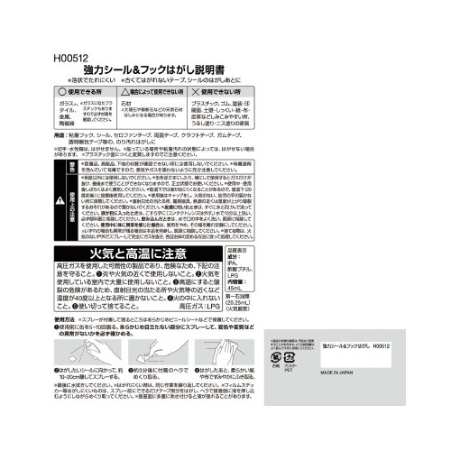 | 注意事項 | ※有機溶剤を含んでいて有毒ですので、蒸気やガスを吸わないように充分注意してください。 ※使用中・使用後しばらくはよく換気してください。 ※使用後はキャップをし、火気のない、幼児の手の届かない所に保管してください。 ※直射日光の当たる所、暖房器具、熱源の近くは温度が上がり破裂するおそれがあるので置かないでください。皮膚に付いたときは、すぐに水と石けんで洗ってください。液が目に入ったときは、こすらずに水で15分以上洗い、必ず眼科医に相談してください。飲み込んだときは、水で口の中をよく洗い、医師に相談してください。 ※捨てる際は、火気のない戸外でスプレーして完全にガスを抜き、各自治体の定める方法に従って処理してください。 以下の点にご注意ください