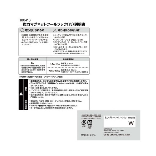注意事項 | ※高荷重のため、掛けるものの落下による破損やケガにご注意ください。 ※万一の落下にそなえて貴重品やこわれやすいものを掛けたり付近に置かないでください。 ※火のそばで使用しないでください。 ※パソコンなどの電子機器・電子医療機器・時計磁気テープなど磁気を嫌うものには近づけないでください。 ※強力磁石なので、開封時や取り付ける際には指などをはさまないようにご注意ください。 ※壁に汚れ・ホコリ・湿気・油分・ワックスなどがあると付きません。 ※荷重制限をお守りください。 ※マグネット裏面のキズ防止シートをはがさないでください。 ※ロープを張るなど、斜め方向の荷重はお避けください。 以下の点にご注意ください