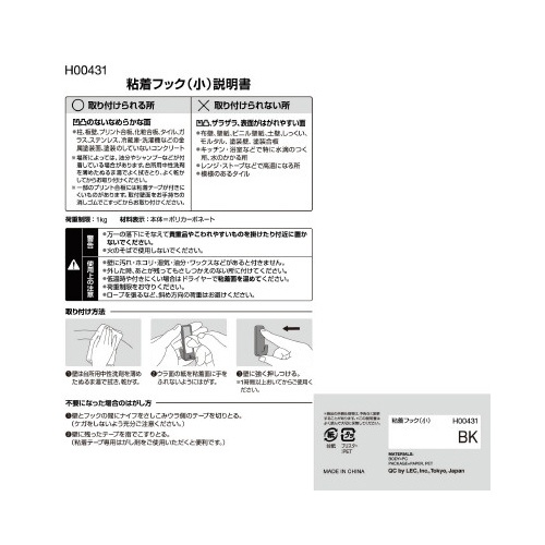 注意事項 | ※万一の落下にそなえて貴重品やこわれやすいものを掛けたり付近に置かないでください。 ※火のそばで使用しないでください。 ※壁に汚れ・ホコリ・湿気・油分・ワックスなどがあると付きません。 ※外した時、あとが残ってもさしつかえのない所に付けてください。 ※低温時や付きにくい場合はドライヤーで粘着面を温めてください。 ※荷重制限をお守りください。 ※ロープを張るなど、斜め方向の荷重はお避けください。 以下の点にご注意ください