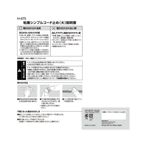 | 注意事項 | ※コードを止める用途以外で使用しないでください。 ※火のそばで使用しないでください。 ※コードの厚みが6mmを超えるものには使用できません。 ※壁紙には使用できません。充分な粘着力が得られず落下したり、はがす際に壁紙が破れるおそれがあります。 ※壁に汚れ・ホコリ・湿気・油分・ワックスなどがあると付きません。 ※外した時、あとが残ってもさしつかえのない所に付けてください。 ※低温時や付きにくい場合はドライヤーで粘着面を温めてください。 以下の点にご注意ください