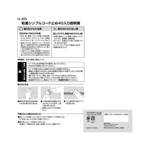 | 注意事項 | ※コードを止める用途以外で使用しないでください。 ※火のそばで使用しないでください。 ※コードの厚みが6mmを超えるものには使用できません。 ※壁紙には使用できません。充分な粘着力が得られず落下したり、はがす際に壁紙が破れるおそれがあります。 ※壁に汚れ・ホコリ・湿気・油分・ワックスなどがあると付きません。 ※外した時、あとが残ってもさしつかえのない所に付けてください。 ※低温時や付きにくい場合はドライヤーで粘着面を温めてください。 以下の点にご注意ください