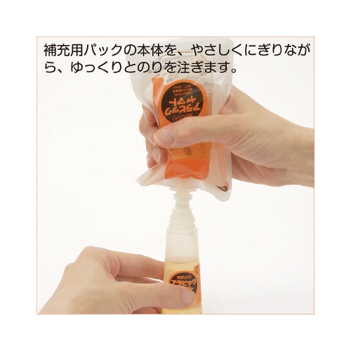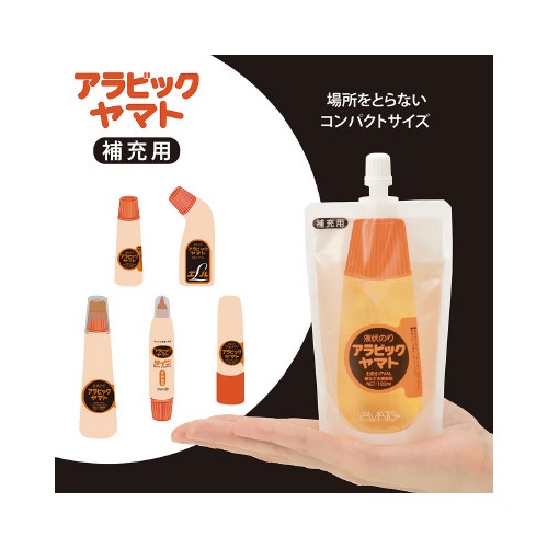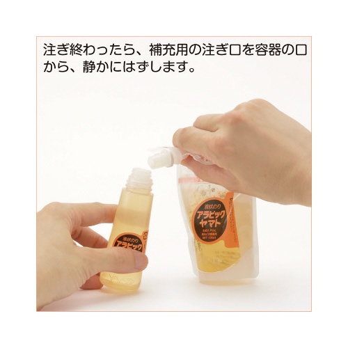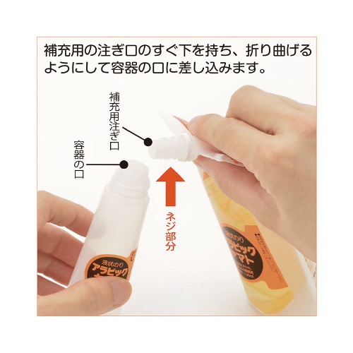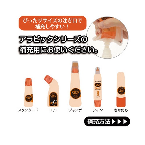 | 注意事項 | ※補充後は、注ぎ口と容器の口についた余分なのりを拭きとってください。 ※ホジュウ語はキャップをしっかりしめて、立てて保管してください。 ※他社製の液状のりをアラビックシリーズにホジュウするとスポンジの目づまりなどが生じますので、お避け下さい。 ※接着以外に使用しないでください。 ※直射日光や高温多湿を避けて保管してください。 ※用事の手の届かないところに保管してください。 以下の点にご注意ください