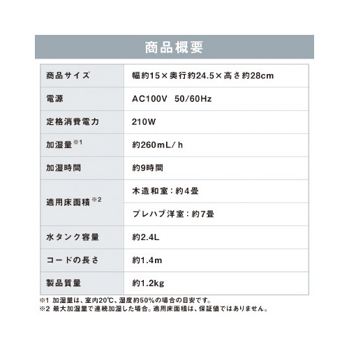 注意事項 | ※【返品に関するご注意】開封後はお客様のご都合による返品はお受けできません。 ※水まわり、風呂場などの湿気のある場所では使用しないで下さい。 ※本体を水につけたり、水をかけたりしないで下さい。 ※屋外では使用しないで下さい。 ※火気・暖房器具などに近づけないで下さい。 ※可燃性ものや、火のついたたばこ・線香などを近づけないで下さい。 ※水道水以外は使用しないで下さい。 以下の点にご注意ください