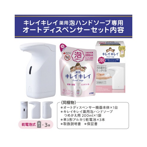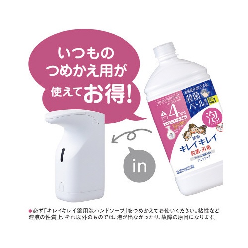 | 注意事項 | ※詰替はキレイキレイ薬用泡ハンドソープをお使いください。 ※他社製品や液体タイプなどをご使用になると故障の原因になります。 ※水中で使用したり、故意に水をかけたり、湿度の高い場所での使用は避けてください。 ※直茶日光の当たる場所には置かないでください。 ※屋外・高温になる環境では使用しないでください。 ※センサー部を直接濡らしたりハンドソープがかからないようにしてください。センサーが反応しなくなる恐れがあります。 ※湿疹・皮ふ炎(かぶれ、ただれ)等の皮ふ障害があるときには、悪化させる恐れがあるので使わないでください。 ※乳幼児や認知症の方のハンドソープの誤飲を防ぐため、置き場所に注意してください。万一飲み込んでしまった場合はすぐに医師に相談してください。 以下の点にご注意ください