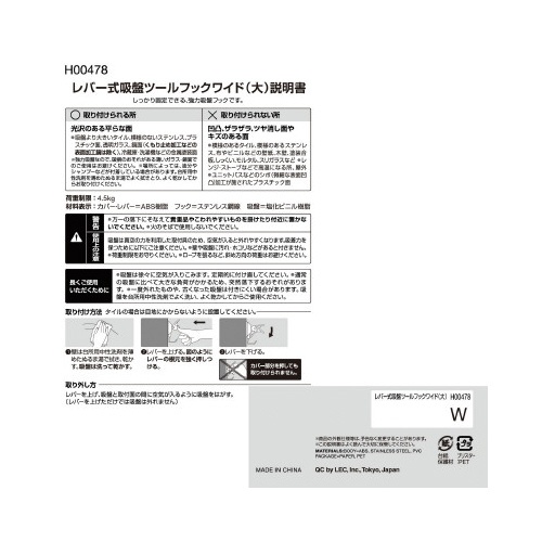レバー式吸盤ツールフックワイド(大)ホワイト