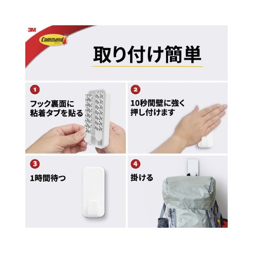 注意事項 | ※取り付けられるところ(凹凸のないなめらかな面):板壁。柱。家具・机(木・スチール製)。ステンレス。冷蔵庫などの金属塗装面。粘着タブよりも大きいタイル。ガラス。人工大理石。プラスチック。化粧板。取り付けられないところ(凹凸面、ざらざら面、曲面、屋外):壁紙(塩ビ製、布製、紙製など)、土壁、砂壁。天然大理石。直射日光の当たるガラス。レンジまわり。40℃以上の高温になるところ。ワックス・フッ素・防カビ加工などの特殊加工のしてあるところ。水分・油分・汚れの付着しているところ。塗装のはがれやすい面。浴室や屋外など、雨や水がかかるところ。 以下の点にご注意ください