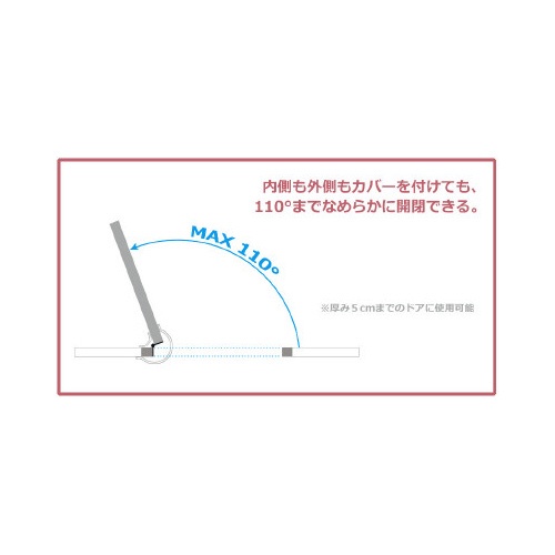 ※取り付け後は、ドアを110°以上開くことは出来ません。無理に開くとドアやフレームに傷が付き場合があります。取り付け後は、定期的に接着部が剥がれていないか確認されるようお願いいたします。本品を剥がす時は、ドア・フレームなどの表面の仕上げや塗装が剥がれる可能性があります。