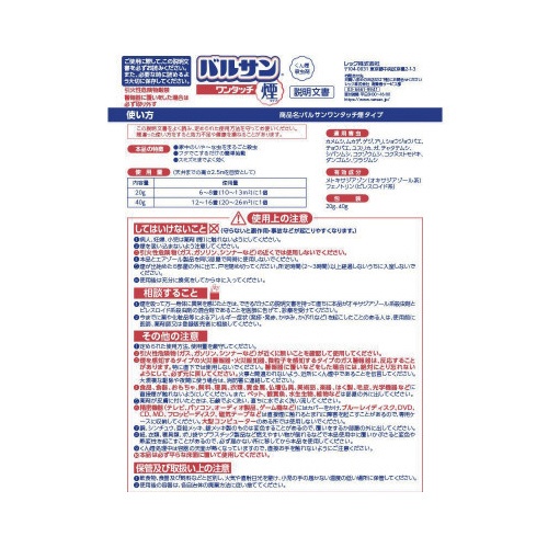 注意事項 | ※今までに薬や化粧品等によるアレルギー症状(発疹・発赤・かゆみ・かぶれなど)を起こしたことのある人は、使用前に医師、薬剤師又は登録販売者に相談すること。 ※煙を感知するタイプの火災報知器に反応することがあるので、袋などで覆う(使用後は必ず元に戻す。) ※引火性危険物(ガス・ガソリン・シンナーなど)の近くでは使用しない。 ※火気や直射日光を避け、小児の手の届かない温度の低い場所に保管する。 以下の点にご注意ください