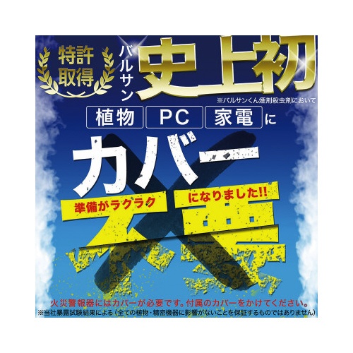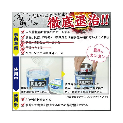 注意事項 | ※定められた使用方法、使用量を厳守してください。 ※煙を感知するタイプの火災警報器・火災報知器、微粒子を感知するタイプのガス警報器は、反応することがあります。特に直下では使用しないでください。警報器に覆いなどをした場合には、絶対にとり忘れないようにして、必ず元に戻してください。火事と間違われないよう、近所にくん煙中であることを伝言してください。大規模な駆除や夜間に使う場合は、消防署に連絡してください。 ※食品、食器、おもちゃ、飼料、寝具、衣類、貴金属、仏壇仏具、美術品、楽器、はく製、毛皮、光学機器などに直接煙が触れないようにしてください。また、ペット、観賞魚、水生生物などは部屋の外に出してください。 以下の点にご注意ください