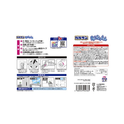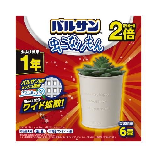 注意事項 | ※万一身体に異常を感じた場合は、本品がピレスロイド系の殺虫剤であることを医師に告げ診療を受けること。 ※商品表示をよく読み使用方法を守って使用する。 ※カートリッジの中のメッシュに手を触れない。誤って触れた場合は石けんでよく洗う。 ※アレルギー症状やかぶれを起こしやすい体質の人は注意して使用する。 ※小児やペットがもてあそぶ場所へ置かない。 ※観賞魚などのいる水槽の近くに本品を置かない、または水槽に本品が入らないようにする。 ※閉め切った部屋や狭い部屋で使用する場合は時々部屋の換気をする。 ※本品は通常1年間効果が持続しますが、使用環境により早く終了する場合があります。 ※害虫が大量に発生し、次々に飛来する場合などは殺虫エアゾールと併用してください。 以下の点にご注意ください