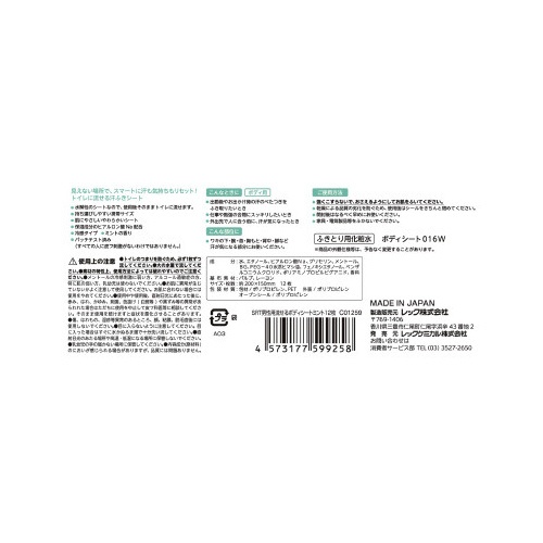 | 注意事項 | ※【返品に関するご注意】開封後はお客様のご都合による返品はお受けできません。 ※トイレつまりを防ぐため1枚ずつ大の水量で流す。 ※素材の特性上、使用方法によっては破れやすいので注意下さい。 ※メントール冷感刺激に弱い、アルコール過敏症、特に肌の弱い方、乳幼児は使用しない。 ※肌に合わない場合は使用をやめる。 ※使用中や使用後、直射日光にあたった後に異常があらわれた場合は使用中止し皮フ科医等に相談する。 ※そのまま使用を続けると症状を悪化させることがあります。 ※傷、はれもの、湿疹等異常のあるところ、顔、粘膜、脱毛直後は使用しない。 ※目に入らないよう注意する。 ※目に入った場合は水かぬるま湯で十分洗い流す。 ※直射日光のあたる場所や高温低温の場所に保管しない。 以下の点にご注意ください