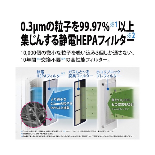 ※フィルターの交換目安/静電HEPAフィルター(交換目安:約10年)、ガスもと−る脱臭フィルター(交換目安:約10年)、抗菌・防カビホコリブロックプレフィルター