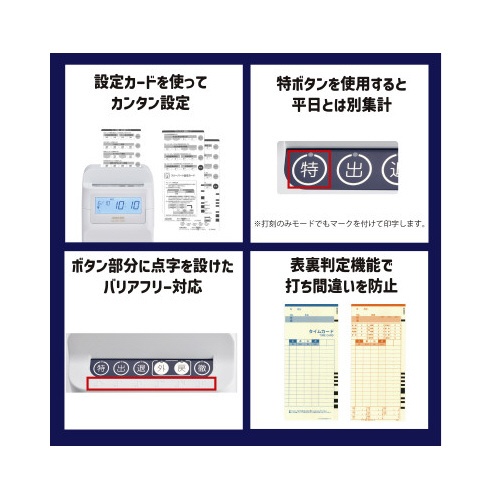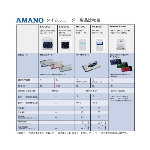 ※月毎集計項目/(1)社員モード利用時:所定内勤務時間数と日数、早出・残業時間帯時間数と日数、深夜残業帯時間数と日数、遅刻・早退時間数と回数(2)時間帯パートモード利用時:時間帯(最大4つ)ごとの勤務時間数と日数。(3)フリーパートモード利用時:基準時間数内勤務時間数と日数、時間外勤務時間数と日数。
