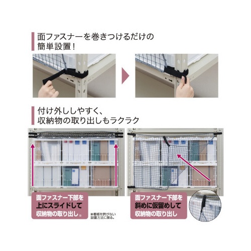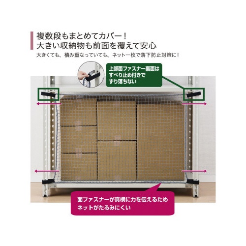 | 注意事項 | ※耐震度は前後上下方向の加振にて測定。試験条件、収納物等によって異なる場合があります。 ※本製品はオープンラック専用です。オープンラックのサイズを確認してからご使用ください。ネットのサイズについて多少の誤差が生じる場合があります。 ※取り付ける対象物が損傷していないことを確認し、損傷がある箇所に取り付けをおこなわないでください。 ※本製品は屋内専用です。製品本来の目的以外の使用は絶対にしないでください。特にお子様にご注意ください。 以下の点にご注意ください