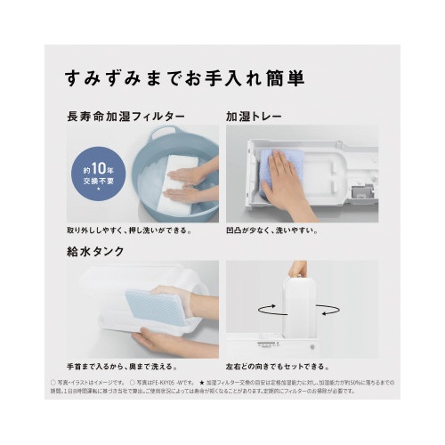 注意事項 | ※【返品に関するご注意】開封後はお客様のご都合による返品はお受けできません。 ※1.適用面積の目安は、(一社)日本電機工業会規格(JEM1426)に基づき、プレハブ住宅洋室の場合を最大適用面積とし木造和室の場合を最小適用面積としたものです。 ※ただし、壁・床の材質・部屋の構造・使用暖房器具等によって適用面積は異なります。 ※2.加湿量は(一社)日本電機工業会規格(JEM1426)に基づく、室温20℃湿度30%の場合。 ※自己調湿機能がありますので高湿になると加湿量が減少します。 ※3.「お急ぎ」モードは約30分間のみの運転。約30分後は、前のモードに戻ります。 以下の点にご注意ください