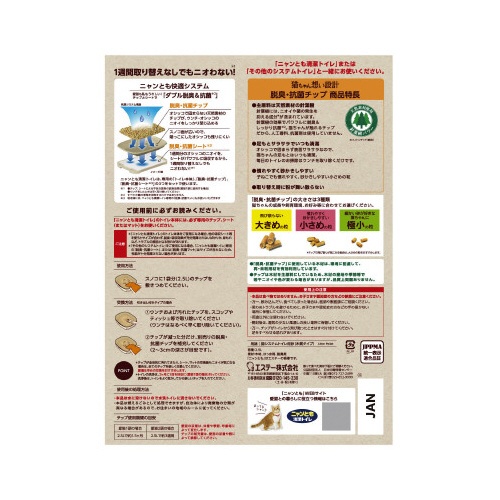 注意事項 | ※・「ニャンとも清潔トイレ」または「その他のシステムトイレ」と一緒にお使いください。・本品は食べ物ではありません。・万一、口に入れてしまった場合は、医師や獣医師にご相談ください。・用途以外には使わないでください。・万一、チップがトイレから飛び散ったときはすぐ片付けてください。・「ニャンとも清潔トイレ」の本体には、必ず専用のチップ、シート(またはマット)をお使いください。他の吸収シート等を使うとサイズが合わず、尿漏れの原因や性能が充分発揮されない場合があります。・「その他のシステムトイレ」をご使用になる場合、「ニャンとも清潔トイレ」専用のシート、またはマットはサイズが合わず、性能が十分発揮されない場合があります。 以下の点にご注意ください