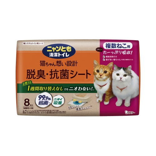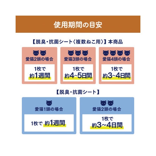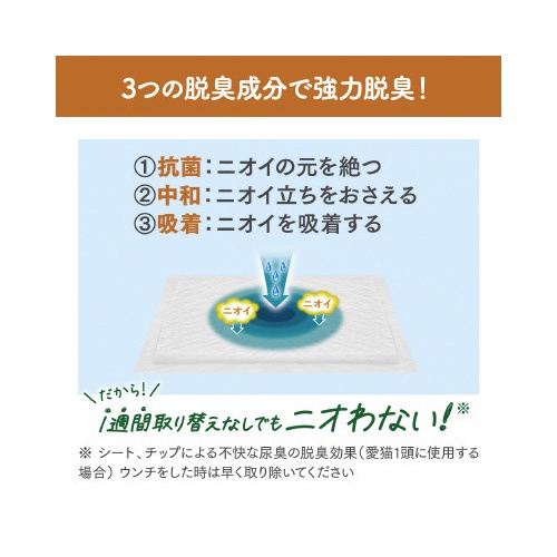 | 注意事項 | ※「ニャンとも清潔トイレ」の専用トイレと一緒にお使いください・本品は食べ物ではありません。お子さまや認知症の方などの誤食にご注意ください。・万一、口にしてしまった場合は、医師や獣医師にご相談ください。・思わぬトラブルを避けるために、お子さまや認知症の方などの手の届かない場所に保管してください。・用途以外には使わないでください。・開封後は、湿気の少ない風通しの良い場所に保管してください。・「ニャンとも清潔トイレ」のトイレ本体には、必ず専用のチップ、シート(またはマット)をお使いください。・他の吸収シート等を使うとサイズが合わず、脱臭・吸収効果が充分発揮されないばかりか、尿もれなど、トラブルの原因となる恐れがあります。 以下の点にご注意ください