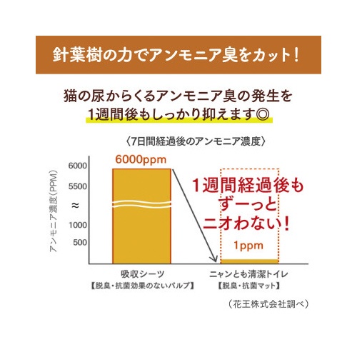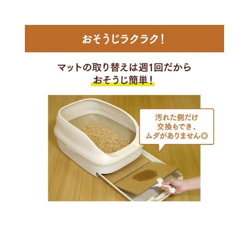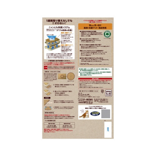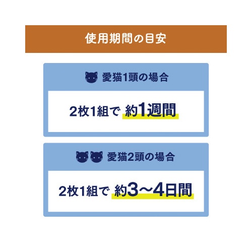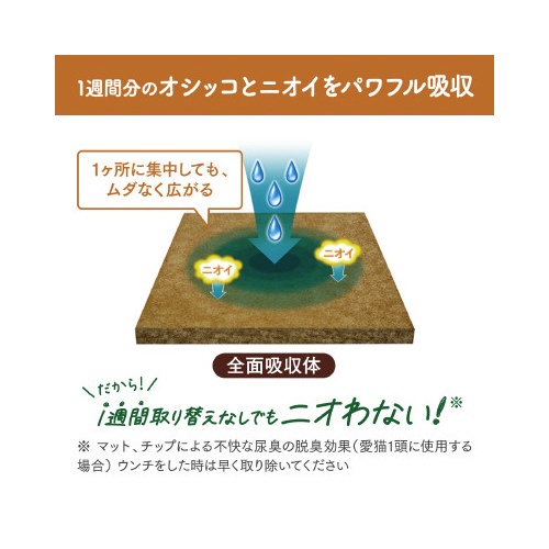 | 注意事項 | ※「ニャンとも清潔トイレ」の専用トイレと一緒にお使いください・本品は食べ物ではありません。お子さまや認知症の方などの誤食にご注意ください。・万一、口にしてしまった場合は、医師や獣医師にご相談ください。・思わぬトラブルを避けるために、お子さまや認知症の方などの手の届かない場所に保管してください。・用途以外には使わないでください。・開封後は、湿気の少ない風通しの良い場所に保管してください。・「ニャンとも清潔トイレ」のトイレ本体には、必ず専用のチップ、シート(またはマット)をお使いください。・他の吸収シート等を使うとサイズが合わず、脱臭・吸収効果が充分発揮されないばかりか、尿もれなど、トラブルの原因となる恐れがあります。 以下の点にご注意ください