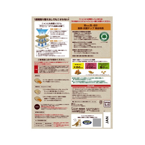 ※・「ニャンとも清潔トイレ」または「その他のシステムトイレ」と一緒にお使いください。・本品は食べ物ではありません。・万一、口に入れてしまった場合は、医師や獣医師にご相談ください。・用途以外には使わないでください。・万一、チップがトイレから飛び散ったときはすぐ片付けてください。・「ニャンとも清潔トイレ」の本体には、必ず専用のチップ、シート(またはマット)をお使いください。他の吸収シート等を使うとサイズが合わず、尿漏れの原因や性能が充分発揮されない場合があります。・「その他のシステムトイレ」をご使用になる場合、「ニャンとも清潔トイレ」専用のシート、またはマットはサイズが合わず、性能が十分発揮されない場合があります。