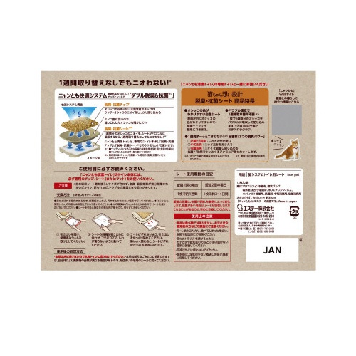 注意事項 | ※「ニャンとも清潔トイレ」の専用トイレと一緒にお使いください・本品は食べ物ではありません。お子さまや認知症の方などの誤食にご注意ください。・万一、口にしてしまった場合は、医師や獣医師にご相談ください。・思わぬトラブルを避けるために、お子さまや認知症の方などの手の届かない場所に保管してください。・用途以外には使わないでください。・開封後は、湿気の少ない風通しの良い場所に保管してください。・「ニャンとも清潔トイレ」のトイレ本体には、必ず専用のチップ、シート(またはマット)をお使いください。・他の吸収シート等を使うとサイズが合わず、脱臭・吸収効果が充分発揮されないばかりか、尿もれなど、トラブルの原因となる恐れがあります。 以下の点にご注意ください