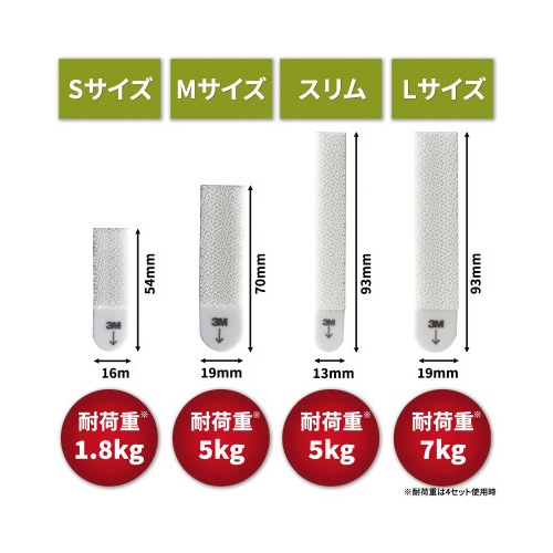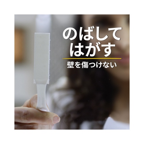 注意事項 | ※時計、カメラ、パソコン、タブレットなど壊れやすいものや高価なもの、貴重なものを掛けない。落下した時に人や物に被害を及ぼすものは掛けない。壁紙(塩ビ製・布製・紙製)には使用不可。落下したときに人や物に被害を及ぼすところには使用しない。荷重制限内で使用する。棚や斜め方向に力がかかる使い方は避ける。扉に使用する際は、激しく扉を開閉すると落下する恐れがある。気温10度以下では接着しにくくなる。 以下の点にご注意ください
