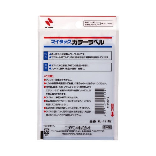 注意事項 | ※プリンターでは使用できません。人体や家具類・貴重品など破損して困るものへは貼らないでください。凹凸面、曲面、布面、プラスチック(フッ素樹脂、ポリエチレン)など、被着体の形状や材質によっては、はがれる場合があります。ラベルには押印は出来ません。貼る部分の汚れや水分、油分をよく拭きとってから常温にてご使用ください。乳幼児の手の届かないところに保管してください。ラベルは袋に入れ、照明や直射日光を避け、高温多湿にならないところで保管してください。 以下の点にご注意ください