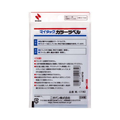 注意事項 | ※プリンターでは使用できません。人体や家具類・貴重品など破損して困るものへは貼らないでください。凹凸面、曲面、布面、プラスチック(フッ素樹脂、ポリエチレン)など、被着体の形状や材質によっては、はがれる場合があります。ラベルには押印は出来ません。貼る部分の汚れや水分、油分をよく拭きとってから常温にてご使用ください。乳幼児の手の届かないところに保管してください。ラベルは袋に入れ、照明や直射日光を避け、高温多湿にならないところで保管してください。 以下の点にご注意ください