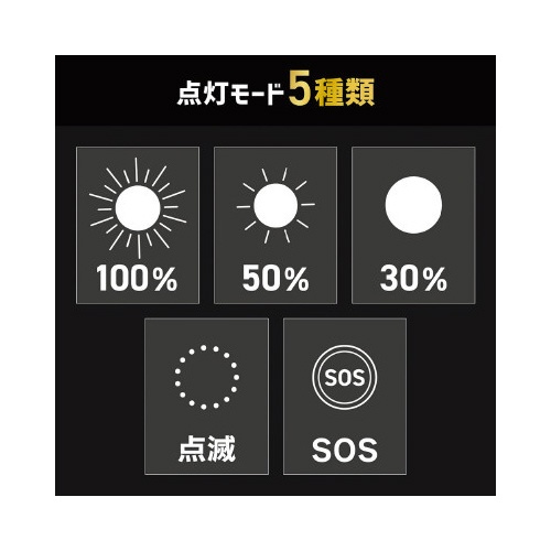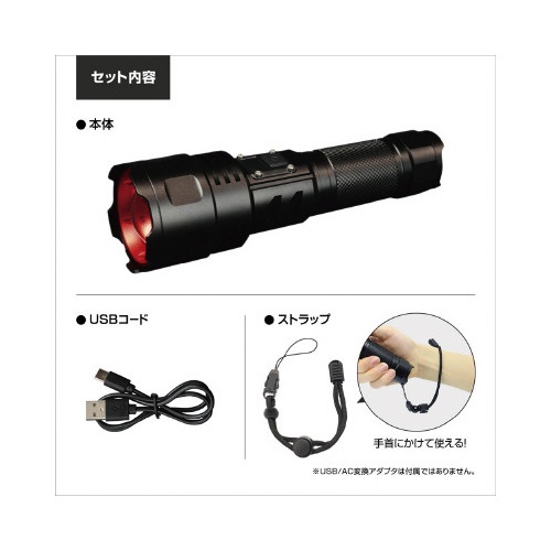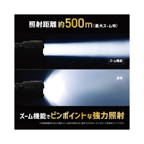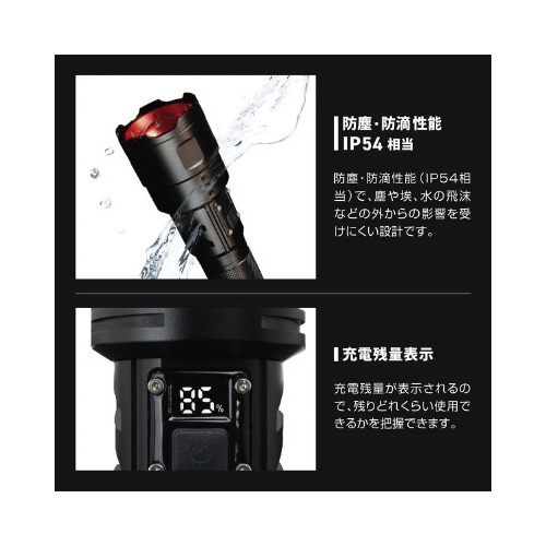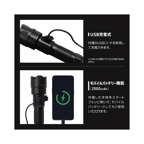 注意事項 | ※電源/USB充電式 ※定格入力/5V1A(USBType−C) ※定格出力/5V1A(USBType−A) ※内蔵充電池/リチウムイオン電池3.7V2500mAh ※保護等級/IP54相当 ※充電時間/約2.5時間(満充電) ※照射距離/最大ズーム時約500m ※最大ズーム時の明るさは、約200lm ※保証期間/6ヶ月充電・使用時間は使用環境(充電池の使用期間やライトの明るさ等)によって異なります。 ※【返品に関するご注意】開封後はお客様のご都合による返品はお受けできません。 以下の点にご注意ください