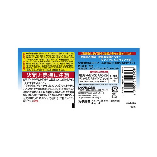 注意事項 | ※ガス警報器に反応することがあるので袋などで覆う(使用後は必ず元に戻す) ※小児の手の届かない涼しい所に保管する ※缶が錆びるとガス漏れの原因となるので水回りや湿気の多い場所には置かない ※暖房器具(ファンヒーターなど)の周囲と高温になる場所では温度が上がり破裂する危険があるので置かない ※引火、爆発のおそれがあるため、本品を噴射時に同じ部屋でくん煙剤を同時使用しない ※捨てる際に火気のない戸外でボタンを押してガスが抜けていることを確認する ※本体記載の【火気と高温に注意】をよく読んで使用する 以下の点にご注意ください