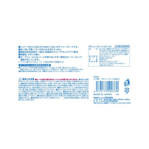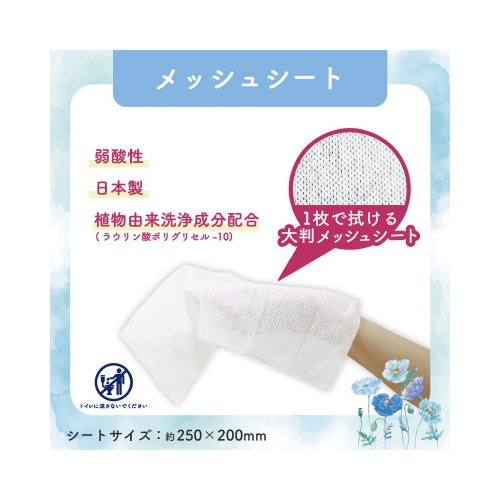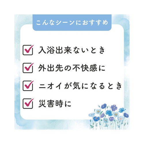注意事項 | ※シートは水に溶けません。トイレには流さない ※アルコール過敏症の方、特に肌の弱い方、乳幼児は使用しない ※お肌に合わない場合は使用をやめる ※使用中や使用後、直射日光にあたった後に、赤みはれかゆみ刺激色抜け(白斑等)や黒ずみ等の異常があらわれた場合は使用を中止して皮フ科医等に相談する。そのまま使用を続けますと、症状を悪化させることがあります ※内容成分(原材料)のにおいが感じられる場合があるが品質には問題なし ※開封後はなるべく早くご使用下さい ※【返品に関するご注意】開封後はお客様のご都合による返品はお受けできません。 以下の点にご注意ください