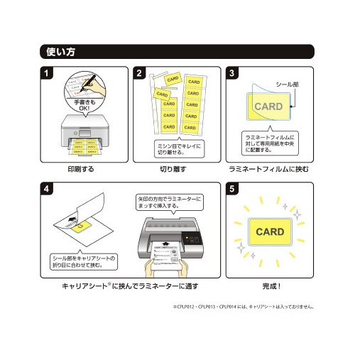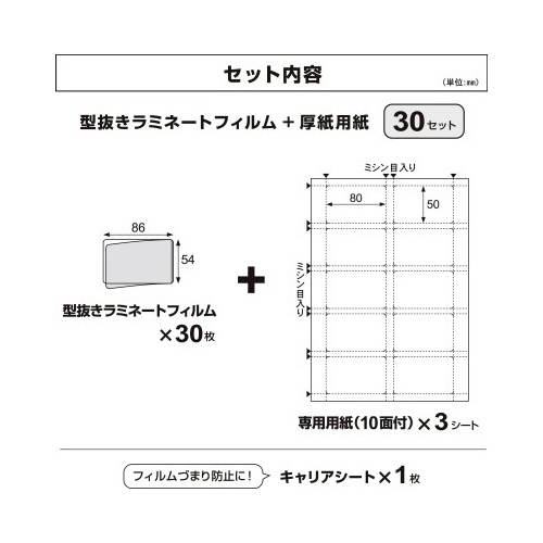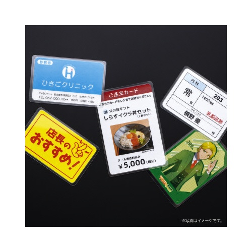| 注意事項 | ※【返品に関するご注意】開封後はお客様のご都合による返品はお受けできません。 ※ご使用にはラミネーター(最大ラミネート幅100mm以上の機種)とプリンタが必要です ※必ず専用の用紙とセットでご使用ください ※お使いのラミネーター付属の取り扱い説明書をよくお読みのうえ、正しくご使用ください。 ※ミシン目から切り離した用紙を、プリンタに通さないでください。 ※レーザプリンタ・コピー機で両面を印刷する場合は、両面印刷可能な機種をご使用ください。 以下の点にご注意ください