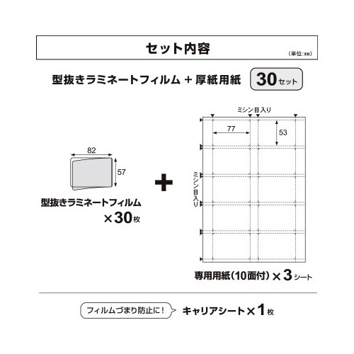 注意事項 | ※【返品に関するご注意】開封後はお客様のご都合による返品はお受けできません。 ※ご使用にはラミネーター(最大ラミネート幅100mm以上の機種)とプリンタが必要です。 ※必ず専用の用紙とセットでご使用ください ※お使いのラミネーター付属の取り扱い説明書をよくお読みのうえ、正しくご使用ください。 ※ミシン目から切り離した用紙を、プリンタに通さないでください。 ※レーザプリンタ・コピー機で両面を印刷する場合は、両面印刷可能な機種をご使用ください。 以下の点にご注意ください