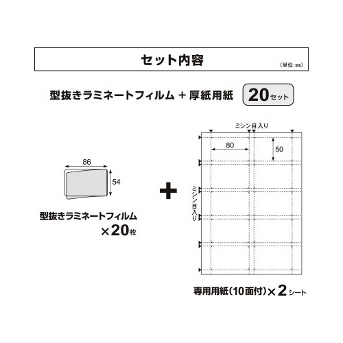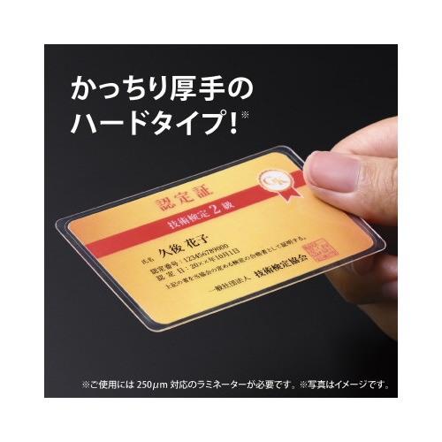 | 注意事項 | ※【返品に関するご注意】開封後はお客様のご都合による返品はお受けできません。 ※ご使用にはラミネーター(最大ラミネート幅100mm以上の機種)とプリンタが必要です。 ※250μm対応のラミネーターが必要です。 ※必ず専用の用紙とセットでご使用ください ※お使いのラミネーター付属の取り扱い説明書をよくお読みのうえ、正しくご使用ください。 ※ミシン目から切り離した用紙を、プリンタに通さないでください。 以下の点にご注意ください