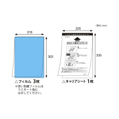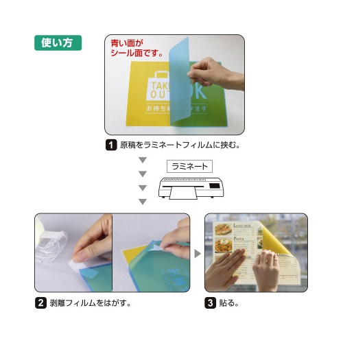 | 注意事項 | ※【返品に関するご注意】開封後はお客様のご都合による返品はお受けできません。 ※被着面の素材によっては、ラミネートフィルムをはがす際に一緒にはがれる(破れる)恐れがあります。目立たない所で試してからご使用ください。特殊なエンボス加工が施された面や凹凸がある面には、お使いいただけない場合があります。 ※ラミネートする物より周囲が、それぞれ2−3mm大きなものが最適です。余白が大きいとフィルムの糊がにじみ出て詰まりの原因となります。 以下の点にご注意ください