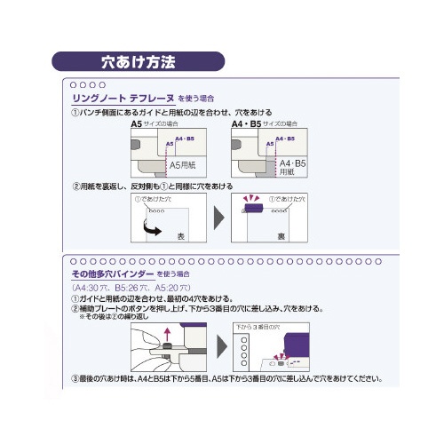 注意事項 | ※仕様・価格・デザインその他は予告なく変更する場合があります。 ※穴あけ枚数はコピー用紙2枚(PPC用紙64g/m2)までです。お子様には絶対に使用させないでください。 ※使用後は、お子様の手の届かない場所に保管してください。ご購入時には刃に防錆油が塗られています。 ※コピー用紙以外の用紙、プラスチック板、粘着剤が付着したものなどは穴あけしないでください。 ※可動部(用紙挿入口)には手や指を入れないでください。刃先に触れないようご注意ください。 ※穴をあける際は押し込む力が均一になるようにあけてください。 以下の点にご注意ください