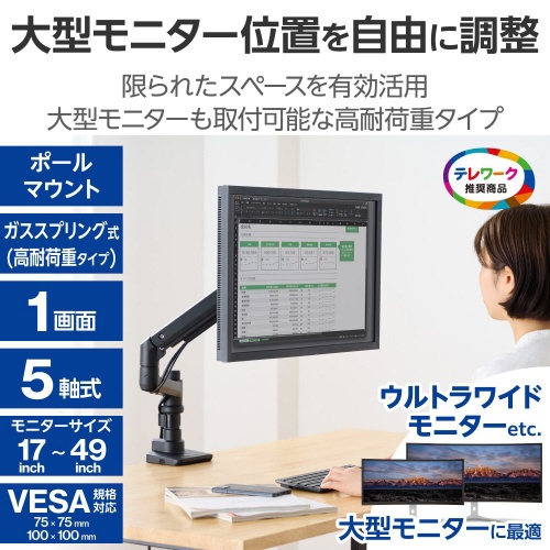 モニターアーム シングル 支柱 高耐荷重 ブラック