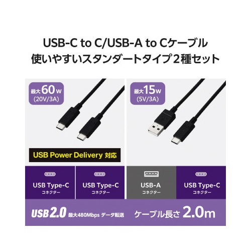 2. タイプCケーブル 2本 A−C/C−C 2m 黒