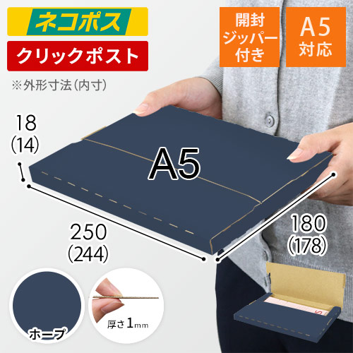 表面に紺色のカラーライナーを使用したメール便ケース。高級感ある見た目に仕上がるため、通販商品の発送やパッケージなどにおすすめです。