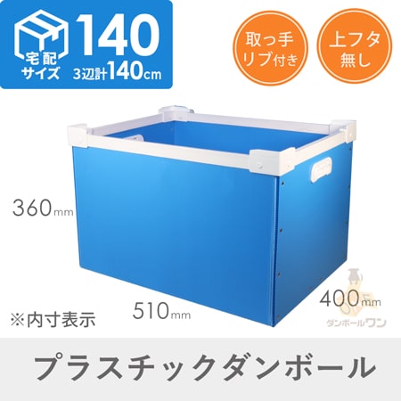 内寸:510×400×360mm、宅配140サイズの取っ手付きプラダン製コンテナ(蓋なし)です。部品・書類等の保管や輸送用として、繰り返し利用可能な通い箱として最適です。