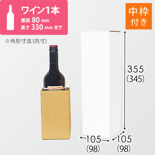 宅配便60サイズで、ワイン1本用の白色ダンボール箱。テープ不要で組み立てができ、箱専用の内枠付きで安全に発送ができる設計です。日本酒などにも便利です。