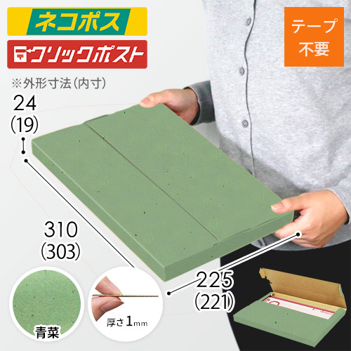 表面に青菜色のカラーライナーを使用したメール便ケース。高級感ある見た目に仕上がるため、通販商品の発送やパッケージなどにおすすめです。