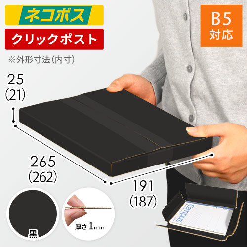 表面に黒色のカラーライナーを使用したメール便ケース。高級感ある見た目に仕上がるため、通販商品の発送やパッケージなどにおすすめです。