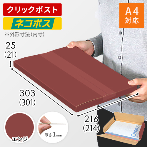 表面にエンジ色のカラーライナーを使用したメール便ケース。高級感ある見た目に仕上がるため、通販商品の発送やパッケージなどにおすすめです。
