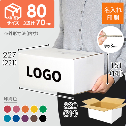 宅配80サイズの白色ダンボール箱に、お客様のロゴや社名などを名入れ印刷します(K-80、M-80、M-80Sと同サイズ)。