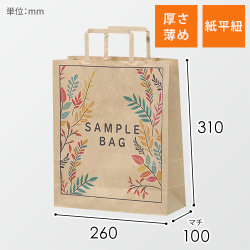 260×100×310mmで平紐・茶色のオリジナル印刷紙袋。小ロットから手軽に作れるため、はじめてオリジナル紙袋を作る方や今の紙袋を見直したい方におすすめです。