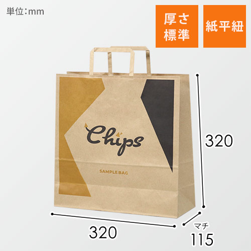 320×115×320mmで平紐・茶色のオリジナル印刷紙袋。小ロットから手軽に作れるため、はじめてオリジナル紙袋を作る方や今の紙袋を見直したい方におすすめです。