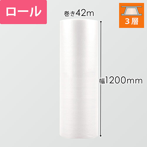 重量物にも使える3層構造のプチプチロール。幅1200mm×42mで、大きな商品や大量包装に便利!外側内側とも凹凸なく、耐久性があるため繰り返し使用できます。