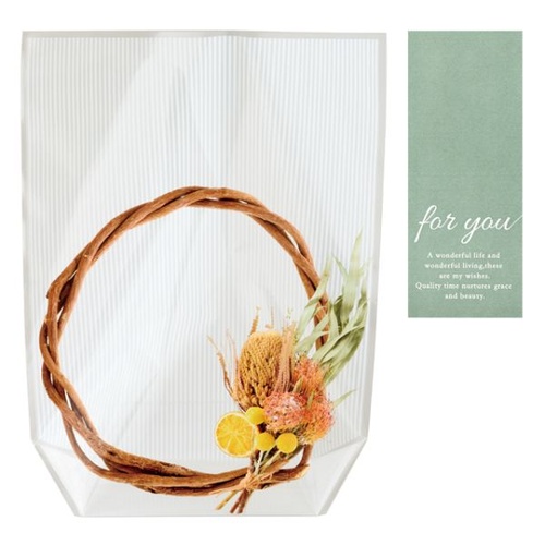 シックなリース柄が魅力のOPPスタンドバッグ。くすみカラーの口留めシール付きで、ギフトラッピングが手軽に上品に仕上がります。