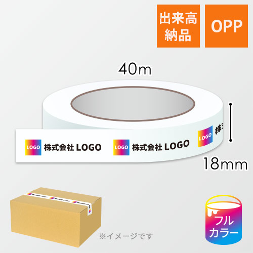18mm×40m巻のOPPテープ。0.065mm厚。お客様のロゴや社名などをフルカラーで名入れ印刷します。