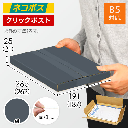 表面に紺色のカラーライナーを使用したメール便ケース。高級感ある見た目に仕上がるため、通販商品の発送やパッケージなどにおすすめです。